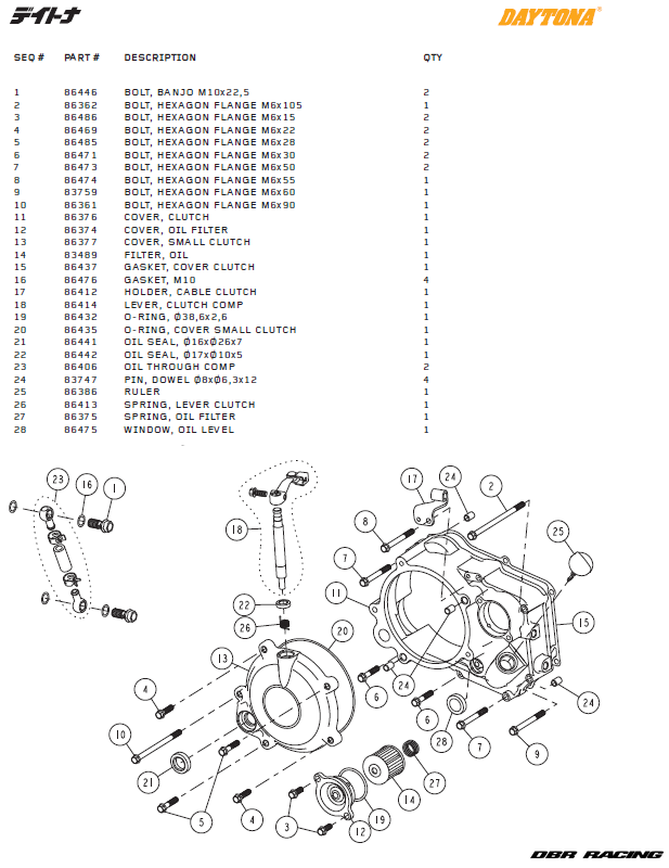 Cover clutch parts Daytona ANIMA®150/190 (4 VALVES). 1 Item=1 pcs Daytona Partno # 1= 86446 BOLT, BANJO M10x22,5 2= 86362 BOLT, HEXAGON FLANGE M6x105 3= 86486 BOLT, HEXAGON FLANGE M6x15 4= 86469 BOLT, HEXAGON FLANGE M6x22 5= 86485 BOLT, HEXAGON …