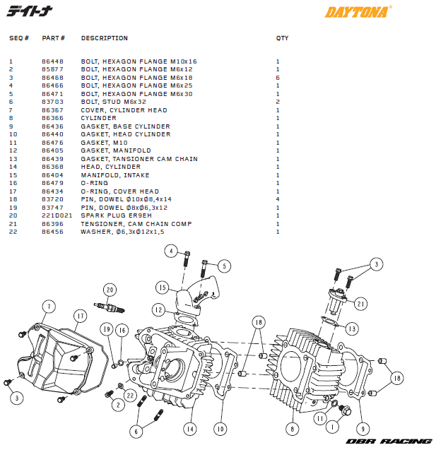 Cylinder head parts Daytona ANIMA®150/190 (4 VALVES). 1 Item=1 pcs Daytona Partno # 1= 86448 BOLT, HEXAGON FLANGE M10x16 2= 85877 BOLT, HEXAGON FLANGE M6x12 3= 86468 BOLT, HEXAGON FLANGE M6x18 4= 86466 BOLT, HEXAGON FLANGE M6x25 5= 86471 BOLT, …