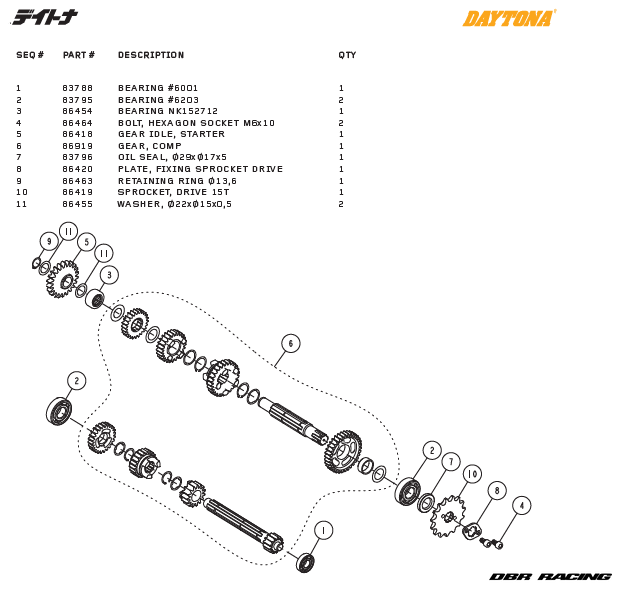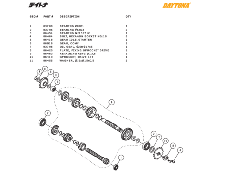 Gearbox parts Daytona ANIMA®150/190 (4 VALVES). 1 Item=1 pcs Daytona Partno # 1= 83788 BEARING #6001 2= 83795 BEARING #6203 3= 86454 BEARING NK152712 4= 86464 BOLT, HEXAGON SOCKET M6x10 5= 86418 GEAR IDLE, S TARTER 6= 86919 GEAR, COMP 7= 83796 OIL …