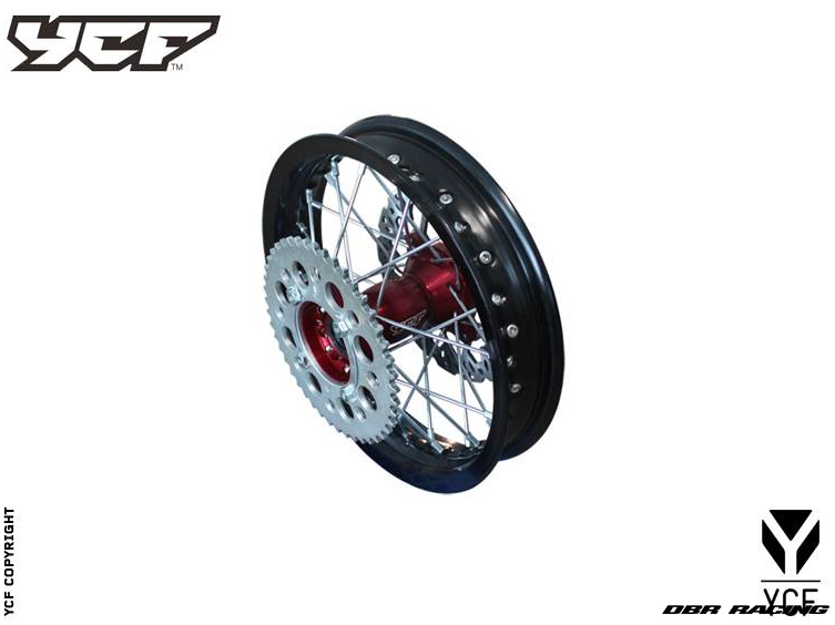 Rear wheel 12" SM YCF Rear wheel 12" SM YCF. ALU, 7116 M 2,50X12 Artno: YC110-1101-44 Fits 15mm wheel axle Super Motard wheel Sprocket and disc brake is included. 2,199 kr