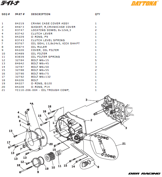 Kopplingskåpa delar till Daytona DT 150cc, T-Rex (2 VALVES).1 Artikel=1 delDaytona Artikelnummer # 1= 84219 CRANK CASE COVER ASSY 2= 84673 GASKET, R,CRANKCASE COVER 3= 83747 LOCATING DOWEL 8×12x6,3 4= 83742 CLUTCH LEVER 5= 84229 O-RING, P9 6= 83743 …